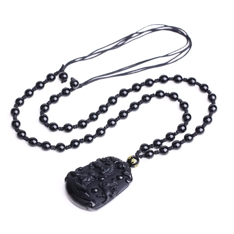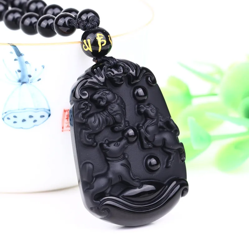 ORIGINAL christmas Natural Obsidian Necklace Seiko Engraving Tiger Dog Horse Patron Pendant halloween